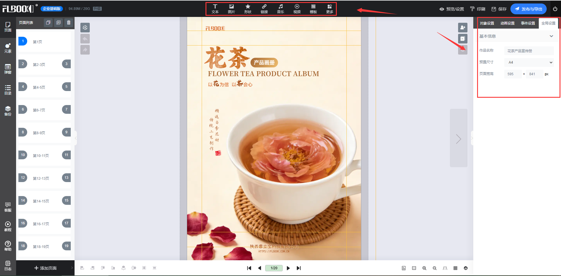 3.点击页面中的元素可以直接修改文字、替换图片。上侧工具栏可以调整字体、颜色、背景,还能添加音乐、视频、表单等互动元素。