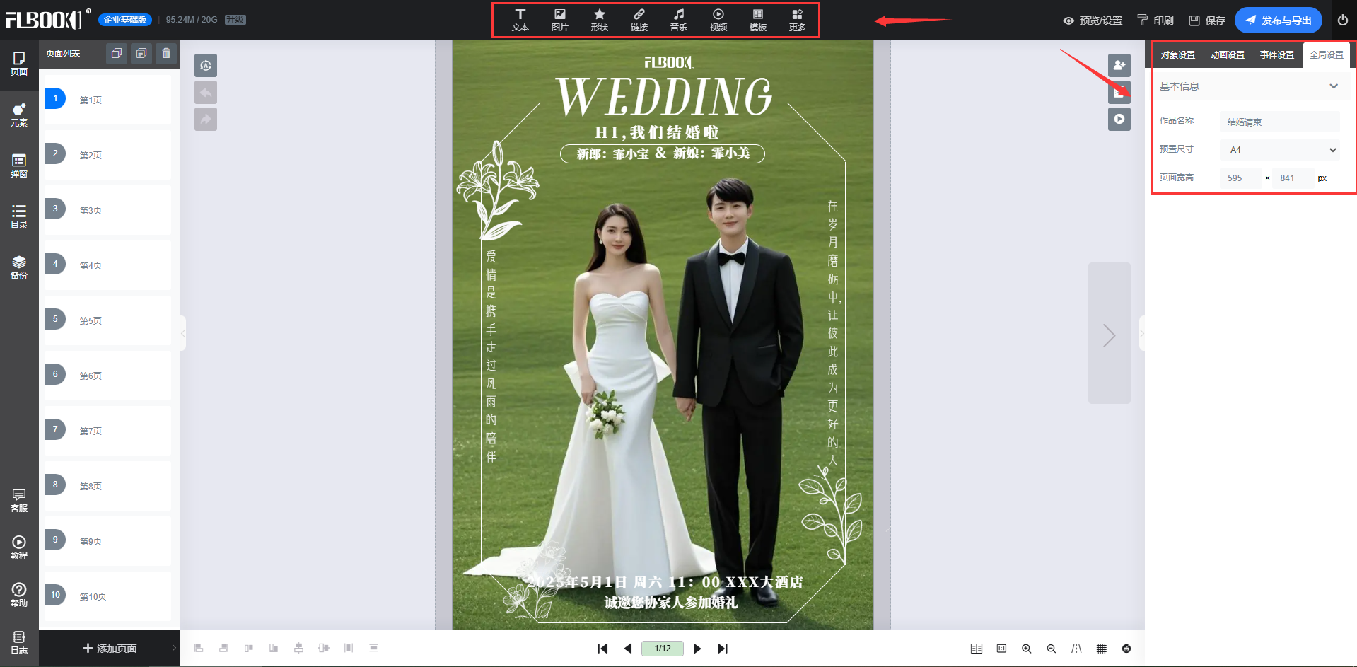3.内容编辑:双击模板中的文字框,直接输入请柬信息(婚礼日期、地点、新人姓名等)点击图片区域,上传本地婚纱照或场地照片替换模板默认图片