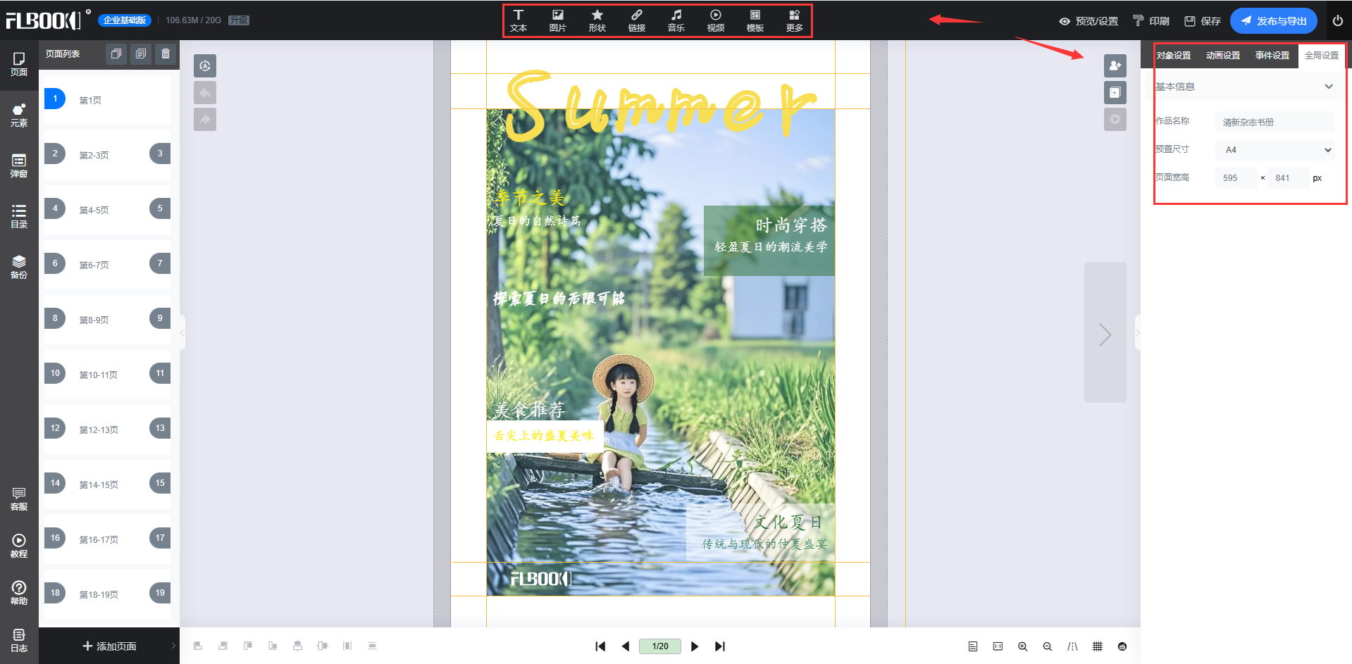 2.上传素材:点击“上传”按钮,将准备好的图片、视频、音频等素材上传到FLBOOK,支持JPG、PNG、视频等多种格式。上传后可通过拖拽操作调整素材的位置和大小。