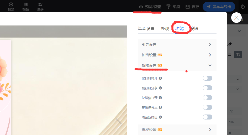 您好: 预览设置-功能设置下,取消访问权限再导出 ,其他问题联系在线客服详细提问解答。