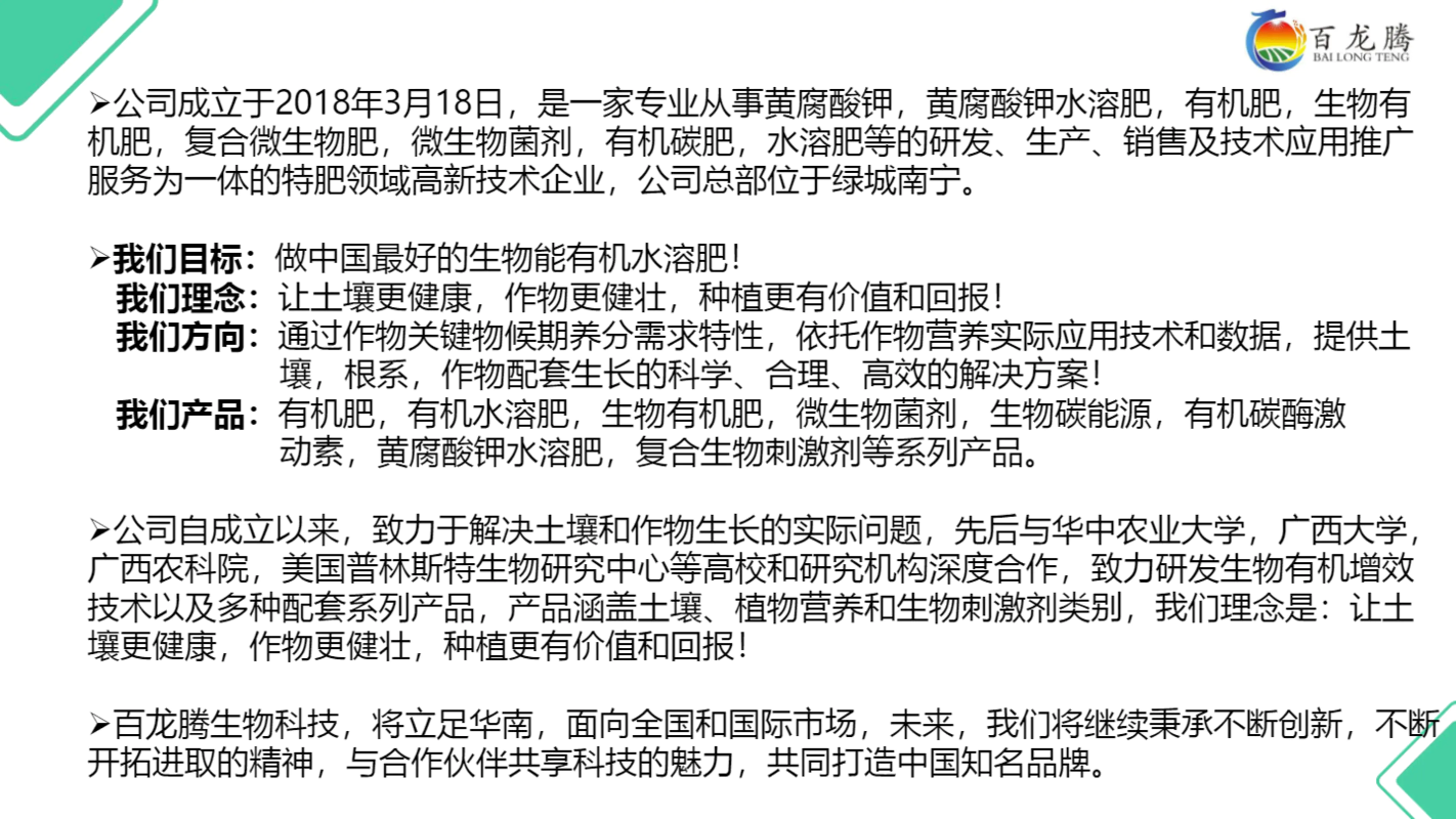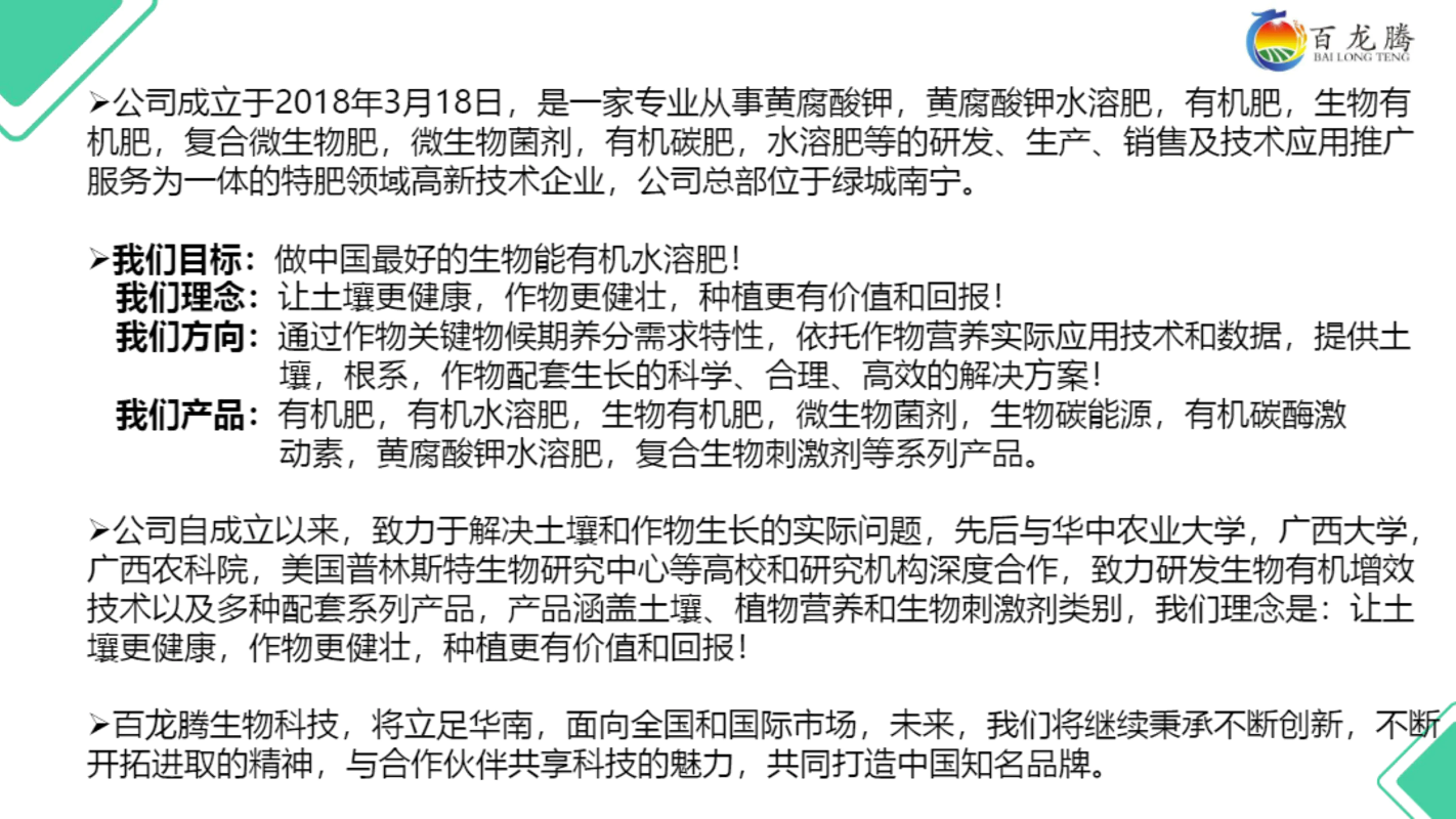 书刊简介:一家专业从事黄腐酸钾,黄腐酸钾水溶肥,生物有机肥,海藻糖蜜生物有机肥,微生物菌剂,有机水溶肥等的研发、生产、销售及农化技术服务为一体的生产企业。主营产品:有机肥,有机水溶肥,生物有机肥,海藻糖蜜生物有机肥,微生物菌剂,生物碳能源,有机碳酶激动素,有机水溶肥,复合生物刺激剂等产品。