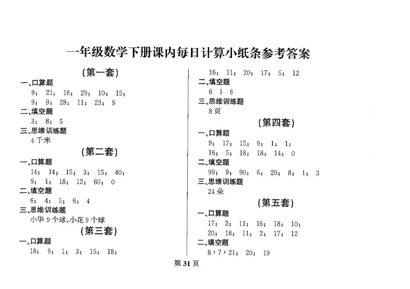 一年级下册数学答...