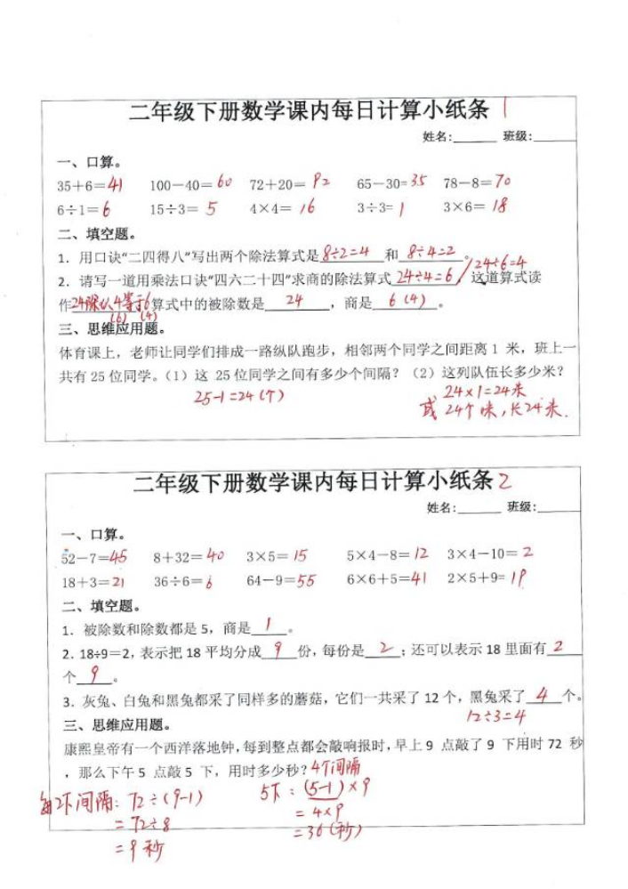 二年级下册数学答...