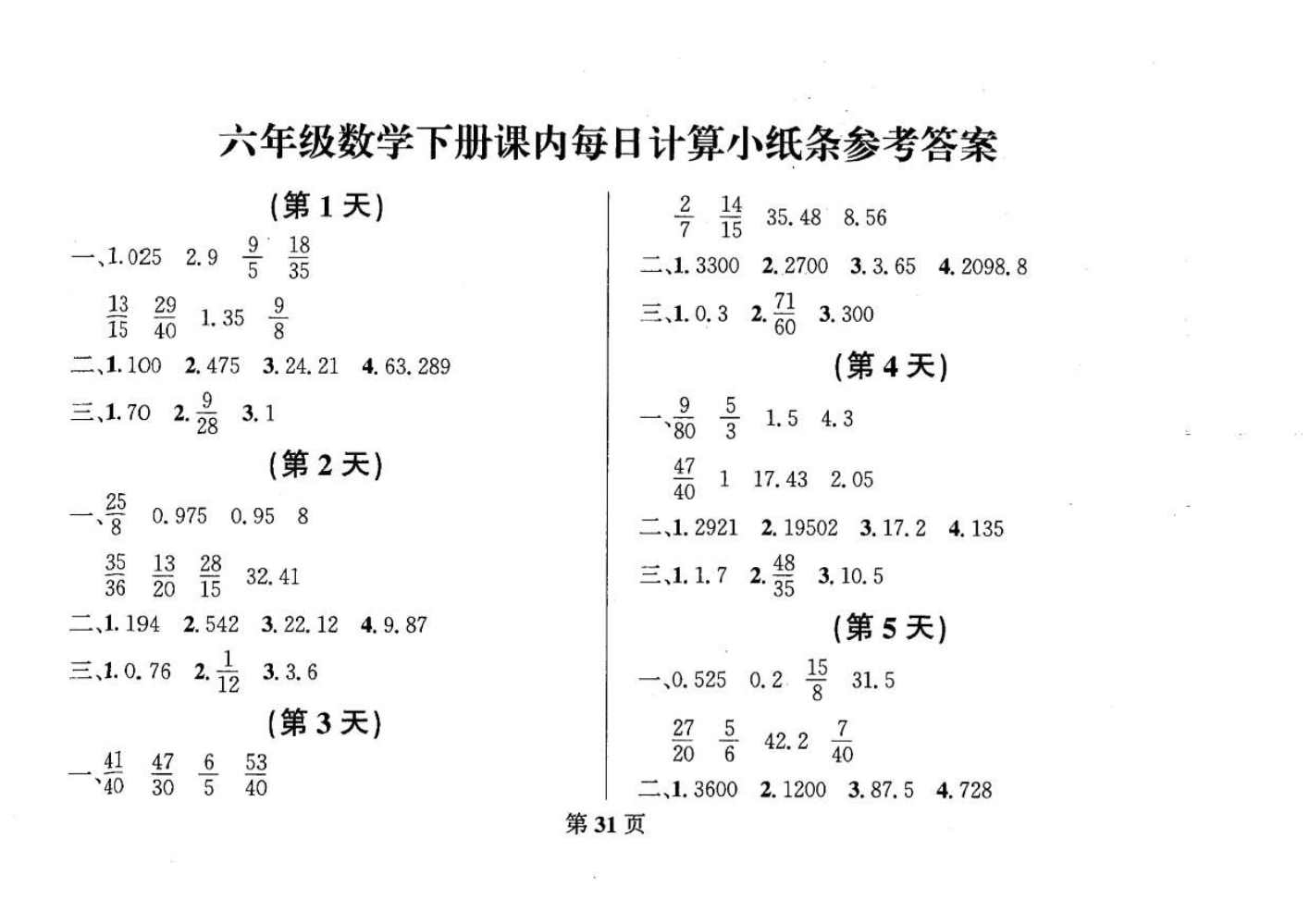 六年级下册数学答...