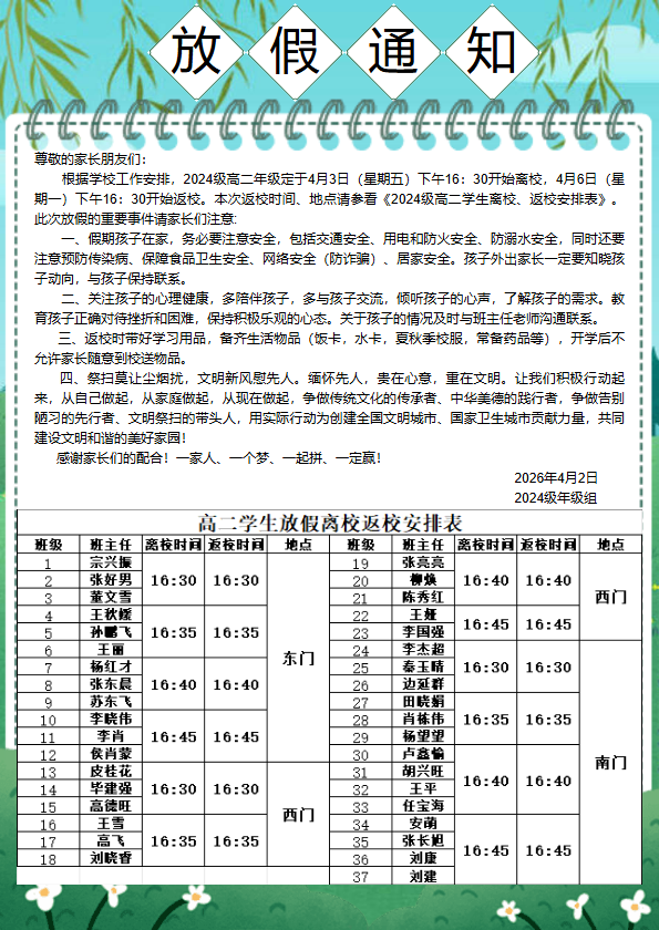 书刊名称:2024级放假通知及家长会安排