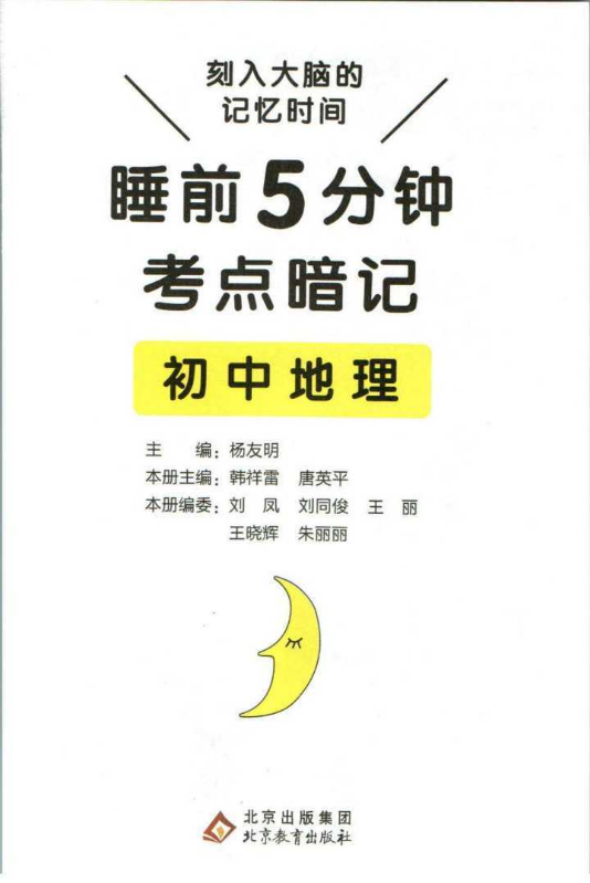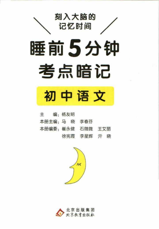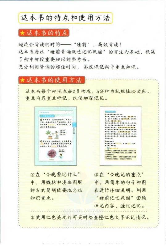 书刊简介:这本书是以“睡前背诵促进记忆巩固”的方法为基础,收集了初中阶段重要知识的参考书。书中的知识点有2页构成,5分钟之内就能轻松读完。重点内容重点标记,以便加深记忆。