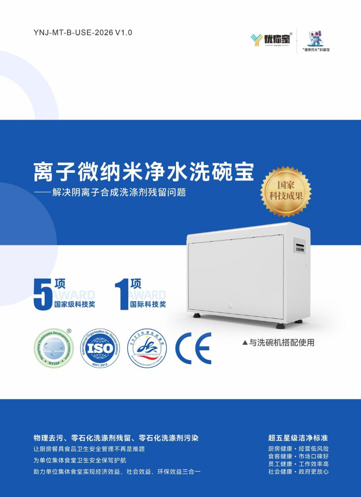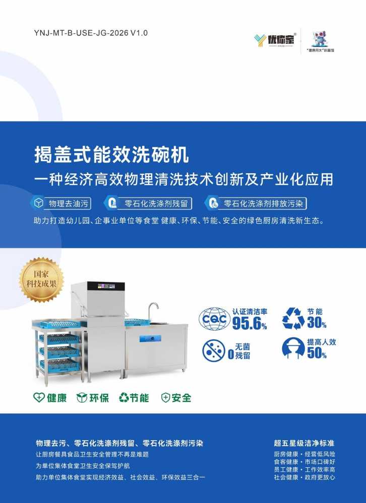 书刊简介:优你家专注“健康用水 · 物理清洗”技术研究,解决阴离子合成洗涤剂残留的健康问题,打造健康、环保、节能、安全的后厨。