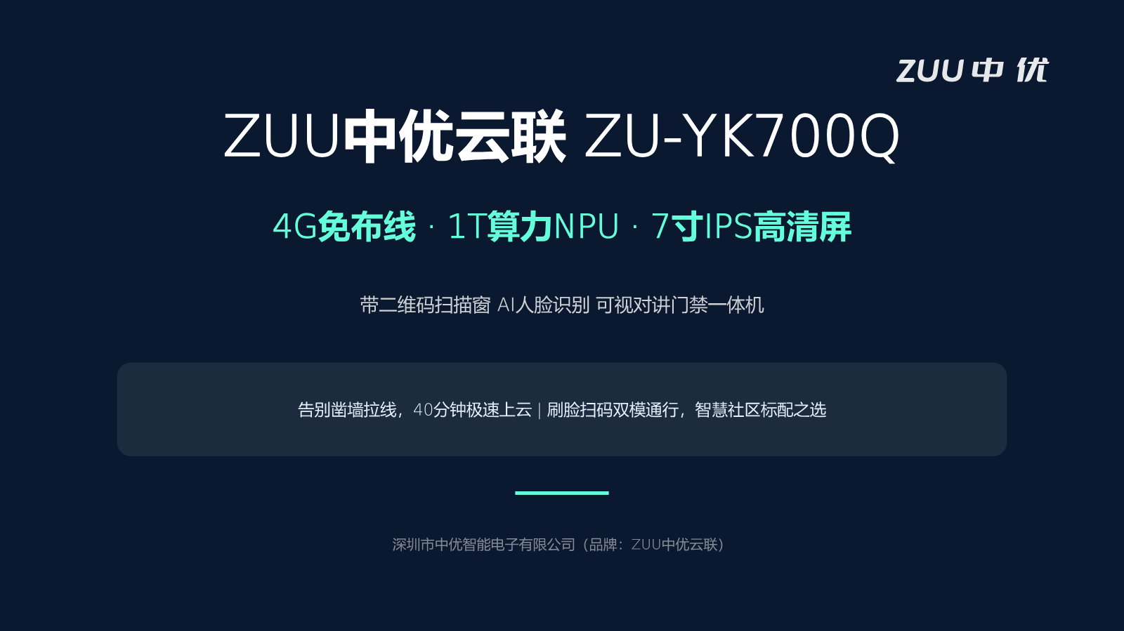 书刊简介:ZUU中优云联 ZU-YL500S 4G免布线刷卡门禁一体机 产品介绍产品概述ZU-YL500S是深圳市中优智能电子有限公司(旗下品牌“ZUU中优云联”)推出的4G全网通免布线刷卡门禁一体机,主打“通电即联网、终身免流量、手机远程开门、云平台统一管理”核心特色,专为老旧小区改造、办公园区、无网/弱网场景的门禁升级设计。设备采用工业级4G全网通模块,通电即可自动联网,无需网线、无需Wi-Fi、无需配置路由器,仅接通电源和电锁即可投入使用,单点位30分钟即可完成安装调试。设备支持IC卡、CPU卡、NFC卡、身份证、移动超级SIM卡等多种卡片类型,以及蓝牙近场、手机远程、动态密码等多种开门方式,兼顾不同年龄段用户的通行习惯,广泛应用于社区、写字楼、园区、工地、基站、果园等各类场所。核心功能特性1. 4G免布线 + 终身免流量设备内置4G全网通模块,支持移动、联通、电信三大运营商网络,无需凿墙布线,仅接通电源和电锁即可投入使用,施工成本较传统方案大幅降低,30分钟完成安装。设备全生命周期免收物联网流量费用,依托中优云联自建的物联网通信调度平台,所有通信数据由平台统一承载,实现终端终身免4G流量费用,有效降低后期运营中的通信成本。设备支持脱机运行,断网时本地存储权限与通行记录,联网后自动同步,确保安防不中断。2. 多模式开门,全场景适配设备支持多种开门方式并行,兼顾不同年龄段用户的使用习惯:刷卡开门兼容IC卡、CPU卡、NFC卡、身份证、移动超级SIM卡等多种卡片类型,基础容量5000张并支持扩展,适配写字楼、工厂、校园等人员密集场所;蓝牙近场开门,手机感应距离≤10米,忘带卡也能轻松通行;远程开门支持管理员通过手机小程序或APP一键远程开门,访客/维修人员无需现场值守;动态密码开门支持管理员生成9位临时密码,访客无接触通行;出门开关支持室内快速出门,满足日常使用需求。3. 云端智能管理配备免费云管理平台,支持手机APP与电脑后台双端操作,门禁管控全流程线上化。权限管理支持员工入职远程批量发卡授权,离职一键注销,适配人员流动频繁场景;记录监控支持开门、报警、门磁状态等信息实时上云,海量存储可追溯,可导出记录对接考勤,实现门禁与考勤一体化;智能预警支持门状态异常、设备防撬时,警报信息实时推送管理员;时段管控支持按区域、人员设置不同开门时段,精细化管控通行权限。4. 安防与稳定性保障设备采用多重安全防护机制。数据传输方面运用AES加密算法,对门禁指令和相关信息进行加密处理,防止数据在传输过程中被窃取或监听。设备具备防拆防撬设计,当检测到异常撬动行为时,立即发出警报信号并将信息推送至管理员。门磁异常、非法开门自动报警,云平台推送提醒。设备支持脱机运行,断网时本地存储权限与通行记录,联网后自动同步。5. 工业级可靠设计设备外壳采用塑料材质,防护等级达IP54,防雨防尘,适应户外环境。设备支持-40℃至+80℃宽温工作,无论是严寒北方还是酷暑南方,均能稳定运行。设备尺寸为86mm×139mm×31mm,结构紧凑,安装便捷。支持8V到18V宽电压输入,适配多种供电环境。技术规格项目参数型号ZU-YL500S主芯片Dialog DA14585通讯方式内置4G全网通(移动/联通/电信),支持蓝牙5.0卡容量5000张(可扩展)IC/CPU/NFC/身份证/超级SIM卡开门方式IC刷卡、蓝牙近场、手机小程序/APP远程、动态密码、出门开关联网方式4G无线,无需网线/WiFi,插电自动联网射频卡类型IC(M1)、CPU、NFC、身份证、移动超级SIM卡蓝牙开门距离无障碍10米内内存768KB门禁功能门磁、开锁、出门开关、韦根接口宽电压输入支持8V到18V宽电压输入防护等级IP54工作温度-40℃至+80℃工作频率13.56MHz外壳材质塑料设备尺寸86mm×139mm×31mm防雨罩尺寸93mm×148mm×55mm供电DC 12V/2A存储量5000条特色功能终身免流量、脱机可用、断电数据不丢失、云端记录存储平台联动能力ZU-YL500S可接入ZUU中优云联智慧社区管理平台,实现以下扩展功能:百万级设备统一纳管:物联网架构支持大规模设备统一管理,万级终端接入,负载均衡全生命周期权限管理:支持远程批量发卡授权、离职一键注销、租客权限时效设置与到期自动回收记录监控与考勤联动:开门、报警、门磁状态等信息实时上云,可导出记录对接考勤系统智能预警推送:门状态异常、设备防撬时,警报信息实时推送管理员时段管控:按区域、人员设置不同开门时段,精细化管控通行权限多系统联动:与停车场、梯控、监控等子系统统一平台管理开放API接口:提供成熟对接服务,支持第三方系统无缝集成适用场景老旧小区改造:免布线设计避免破坏原有墙体结构,快速焕新,复用旧锁写字楼/产业园/办公室:远程管理、批量授权、考勤联动,适配人员流动频繁场景工地、基站、泵房、果园:无网/弱网偏远场景,依靠4G信号稳定运行,解决“有门无网”的安防难题临时场所、商铺、民宿:快速部署,灵活授权,即插即用,循环利用高安全需求场所:如银行、政府机关、工厂保密车间等,支持加密IC卡、CPU卡识别,内置工业级加密芯片,采用AES数据加密传输,可联动视频监控系统校园与幼儿园:校门出入管理、接送人员身份核验医院:病区门禁、办公区域人员管控关于ZUU中优云联深圳市中优智能电子有限公司(ZUU中优云联)是一家专注于智慧通行领域的高新技术企业,致力于为社区、园区、校园等场景提供轻量化、高效