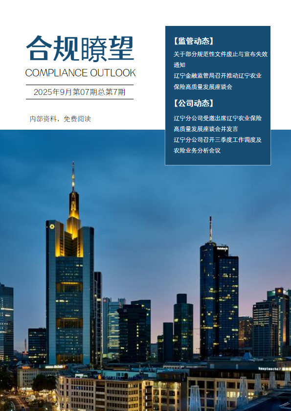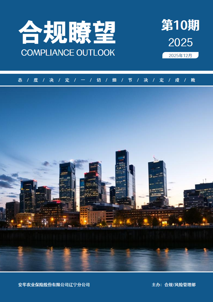 书刊简介:合规瞭望(总第4期),本期聚焦金融监管与行业发展动态,国家金融监督管理总局发布规章修改决定,2025 年防范非法金融活动宣传月启幕;行业领域,保险机构高管合规培训与 “三农” 保险科技赋能论坛相继开展;公司积极响应,同步推进消防安全整治、非法金融防范宣传及规章制度系统性优化,展现合规建设新进程。