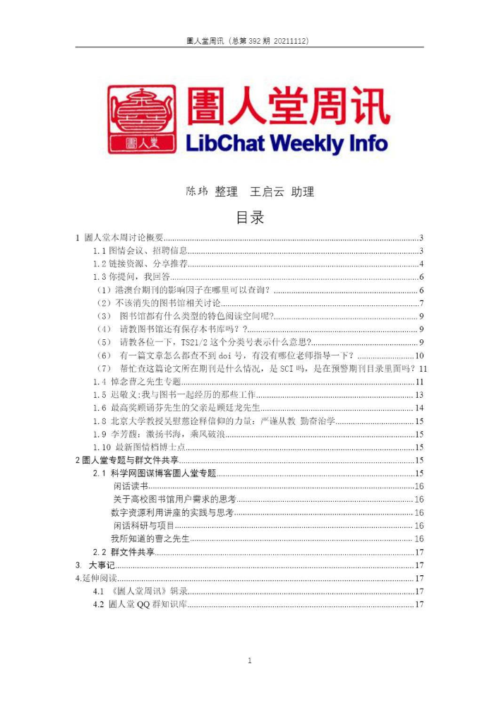 书刊简介:《圕人堂周讯》综述圕人堂QQ群一周交流信息,对圕人堂全体成员公开(通过QQ群邮件推送)、同时亦对社会公开(当前主要通过科学网图谋博客圕人堂专题公开)。圕人堂QQ群(群号:311173426)2014年5月10日创建,《圕人堂周讯》2014年5月16日创办。