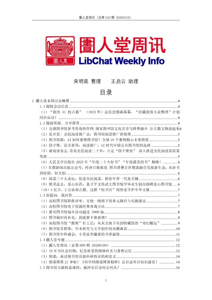 书刊简介:《圕人堂周讯》综述圕人堂QQ群一周交流信息,对圕人堂全体成员公开(通过QQ群邮件推送)、同时亦对社会公开(当前主要通过科学网图谋博客圕人堂专题公开)。圕人堂QQ群(群号:311173426)2014年5月10日创建,《圕人堂周讯》2014年5月16日创办。