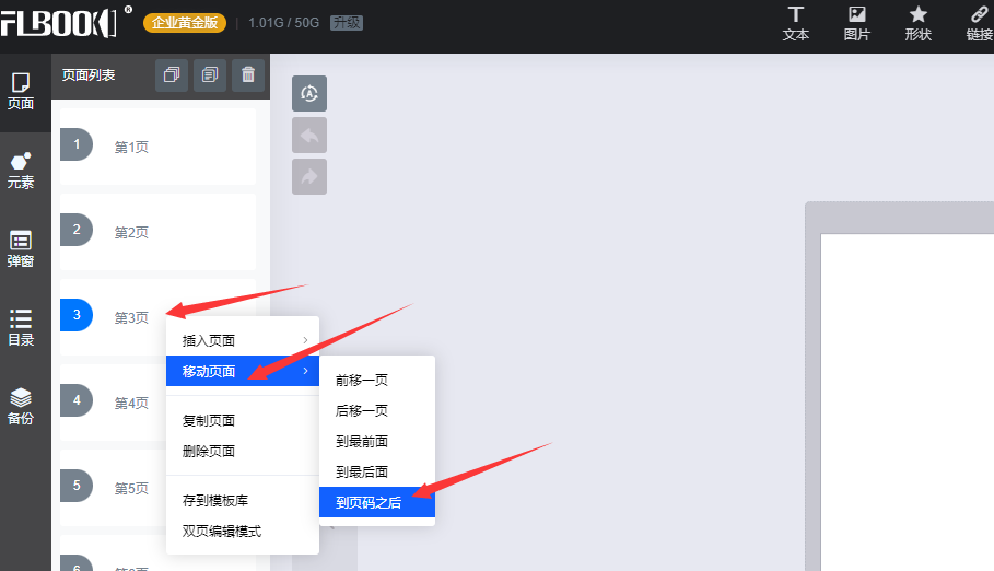排序时注意,请不要双页和单页的拖拽调换顺序,双页的和单页的拖拽调换,会导致页面内容文字悬空,导致内容排版错乱,内容元素丢失。