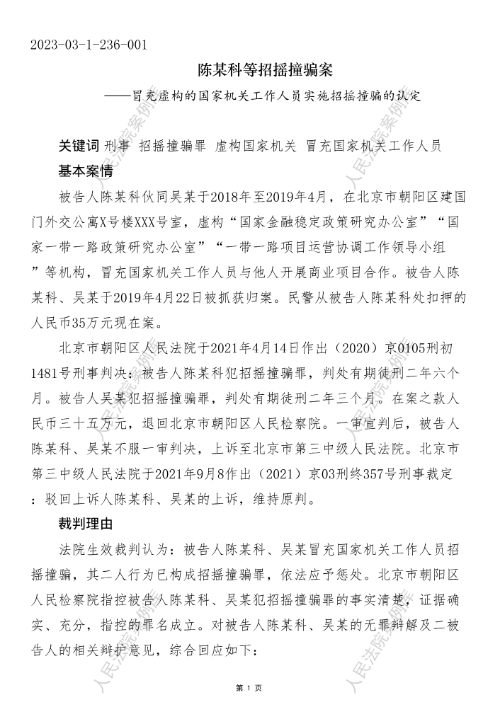 陈某科等招摇撞骗案——冒充虚构的国家机关工作人员实施招摇撞骗的认定
