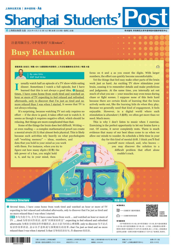《上海学生英文报》高中进阶版报纸。适合高二至高三学生。报刊内容与教材配套,辅助课堂教学和学习;目标量化,拓展学生阅读范围;根据高考题型配置习题,检测学生阅读能力;语篇标注,构建语篇关键要素标注体系。