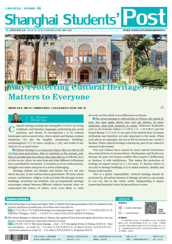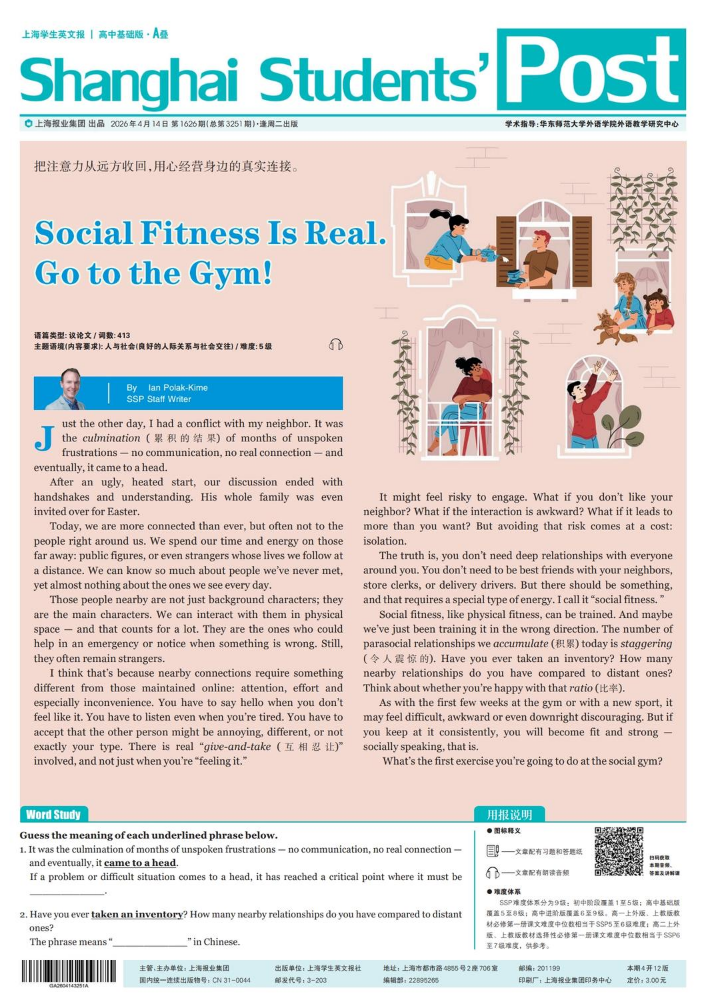 《上海学生英文报》高中基础版报纸,适合高一至高二学生。报刊内容与教材配套,辅助课堂教学和学校;目标量化,拓展学生阅读范围;根据高考题型配置习题,检测学生阅读能力;语篇标注,构建语篇关键要素标注体系。