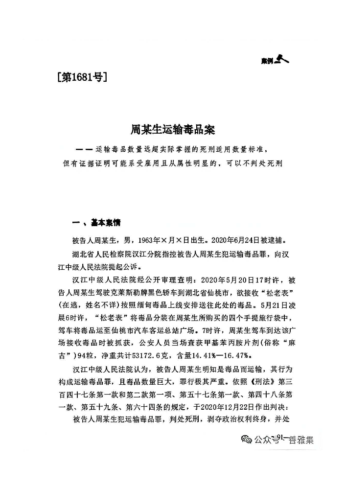 [第1681号]周某生运输毒品案——运输毒品数量远超死刑适用数量标准,但有证据证明可能系受雇用且从属性明显的,可以不判处死刑