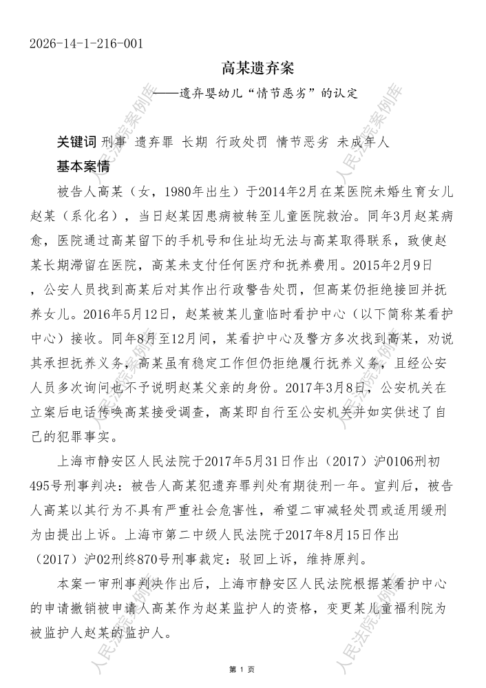 高某遗弃案———遗弃婴幼儿“情节恶劣”的认定
