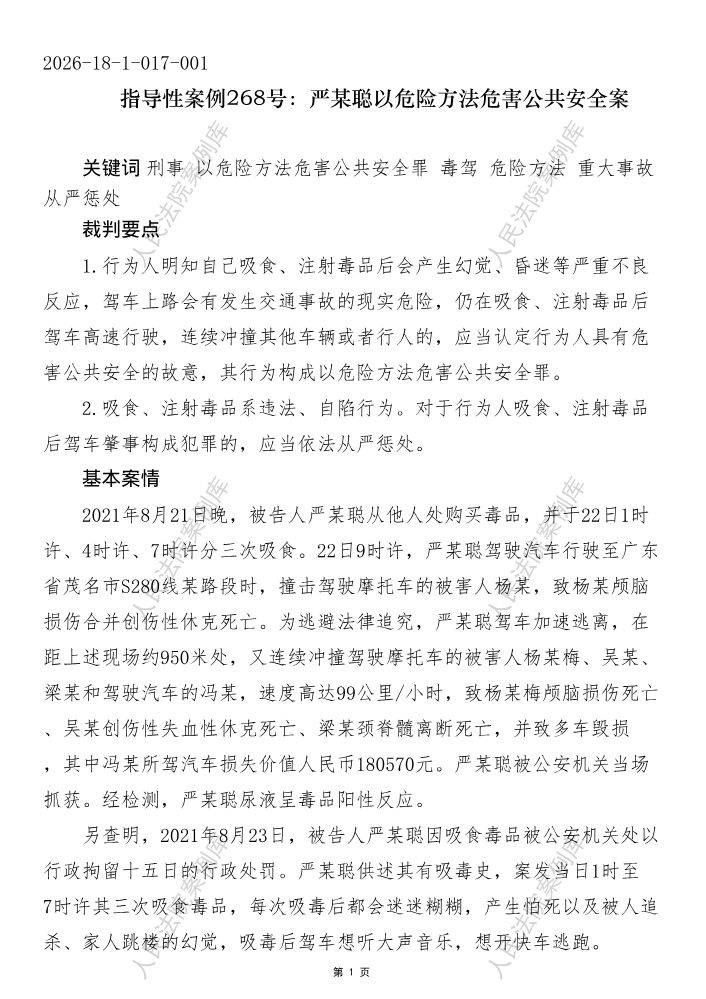 指导性案例268号:严某聪以危险方法危害公共安全案