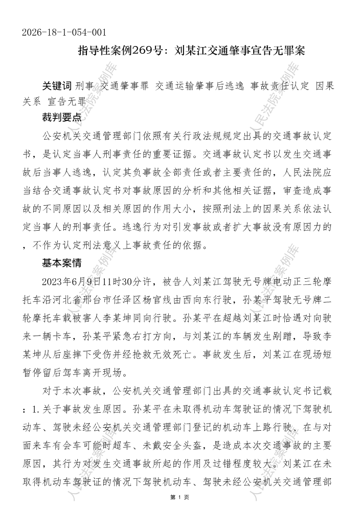 指导性案例269号:刘某江交通肇事宣告无罪案