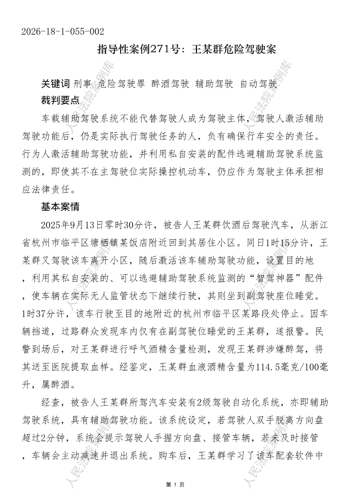 指导性案例271号:王某群危险驾驶案