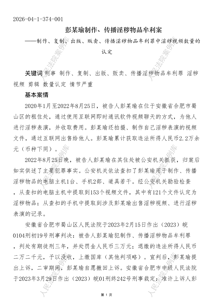 彭某瑜制作、传播淫秽物品牟利案——制作、复制、出版、贩卖、传播淫秽物品牟利罪中淫秽视频数量的认定