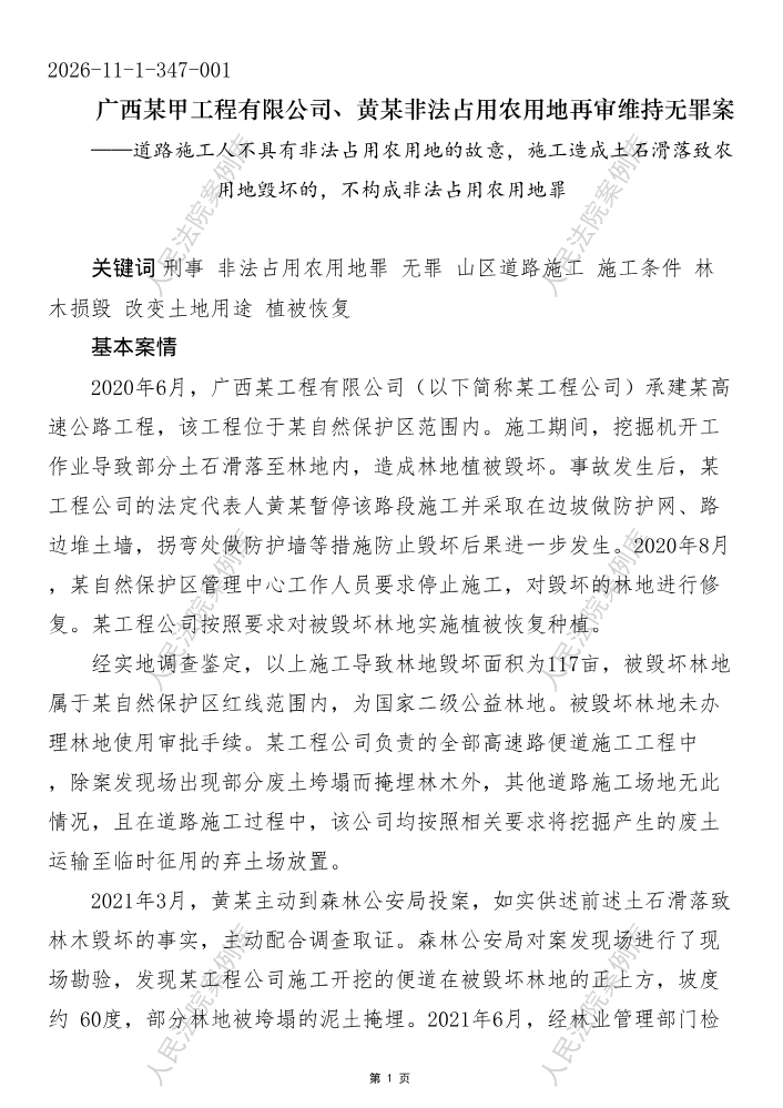 广西某甲工程有限公司、黄某非法占用农用地再审维持无罪案——道路施工人不具有非法占用农用地的故意,施工造成土石滑落致农 用地毁坏的,不构成非法占用农用地罪