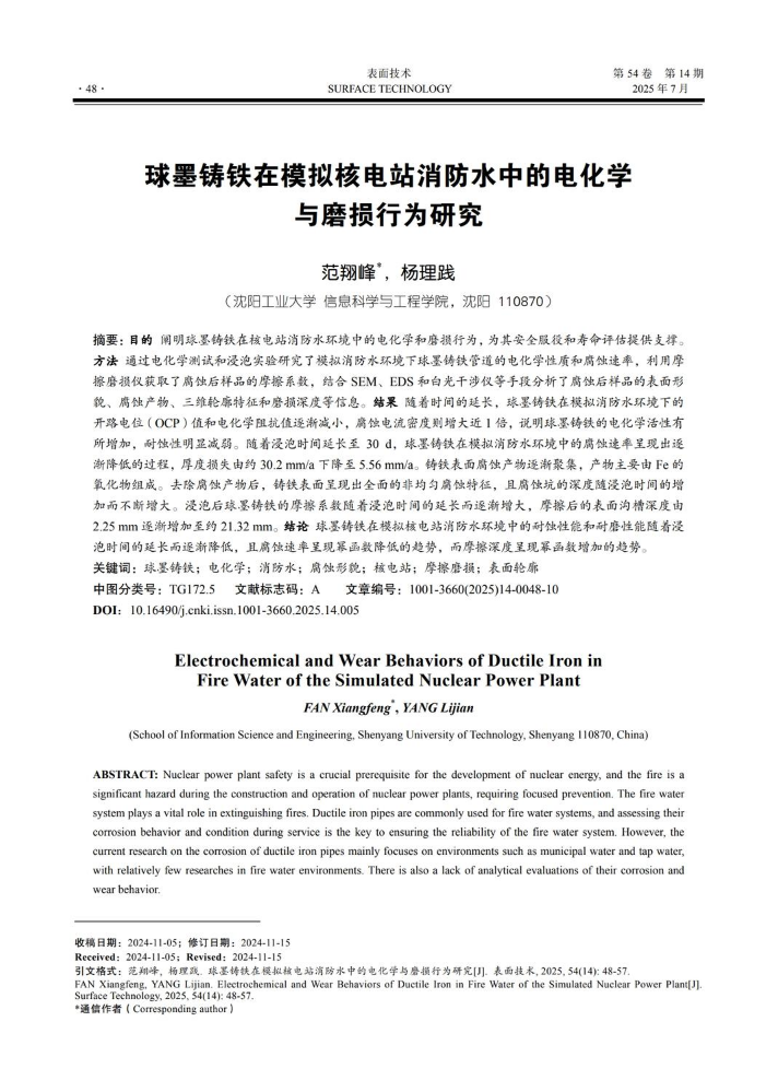 球墨铸铁在模拟核电站消防水中的电化学与磨损行为研究