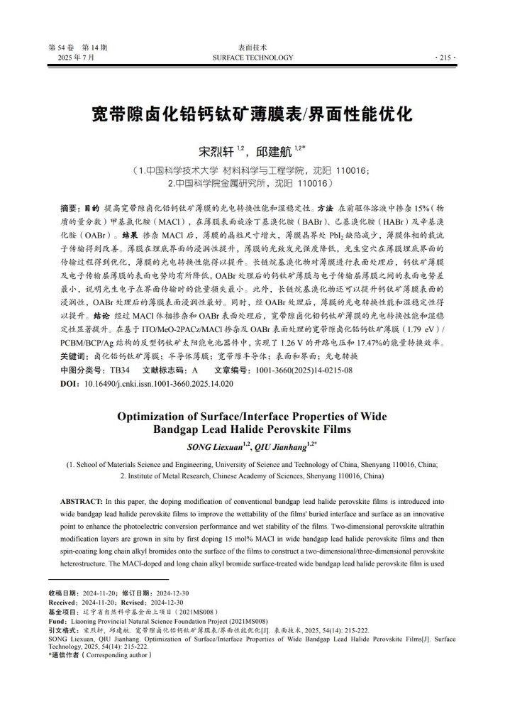 宽带隙卤化铅钙钛矿薄膜表_界面性能优化