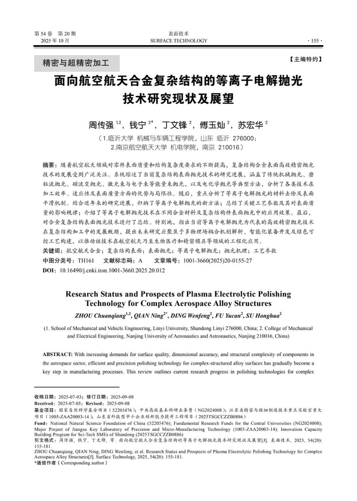面向航空航天合金复杂结构的等离子电解抛光技术研究现状及展望
