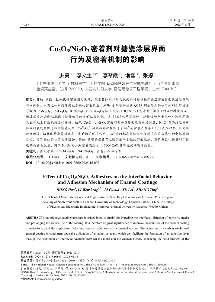 Co2O3_Ni2O3密着剂对搪瓷涂层界面行为及密着机制的影响
