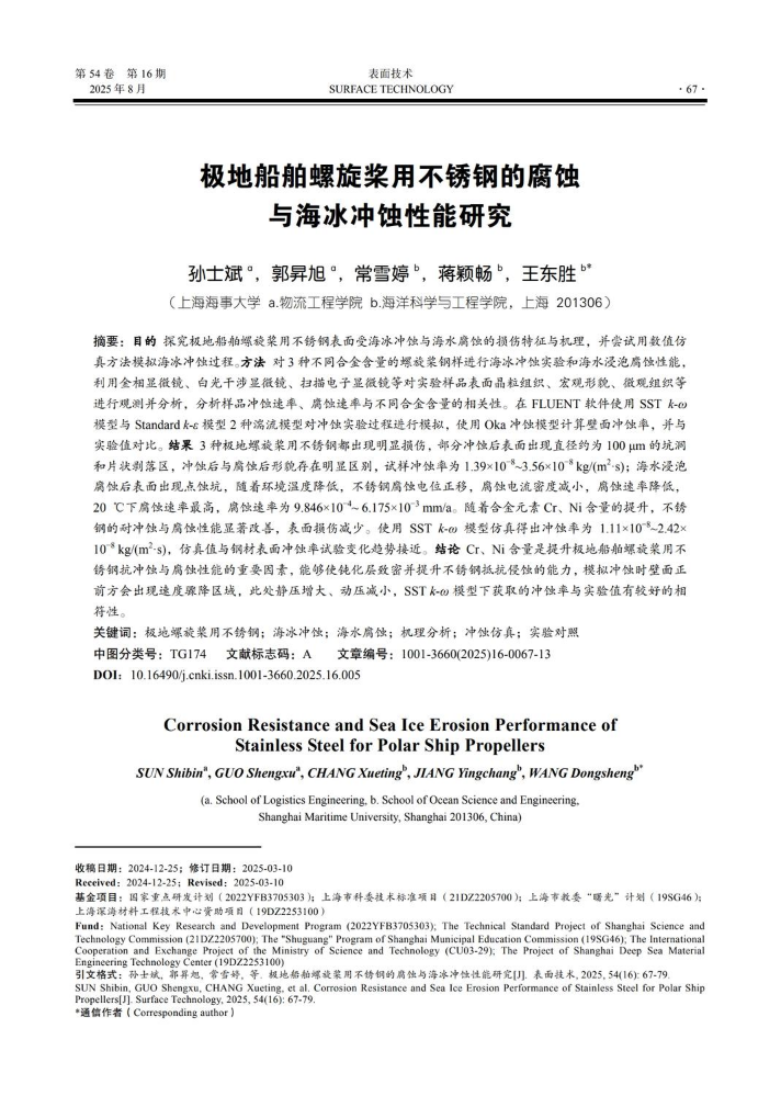 极地船舶螺旋桨用不锈钢的腐蚀与海冰冲蚀性能研究
