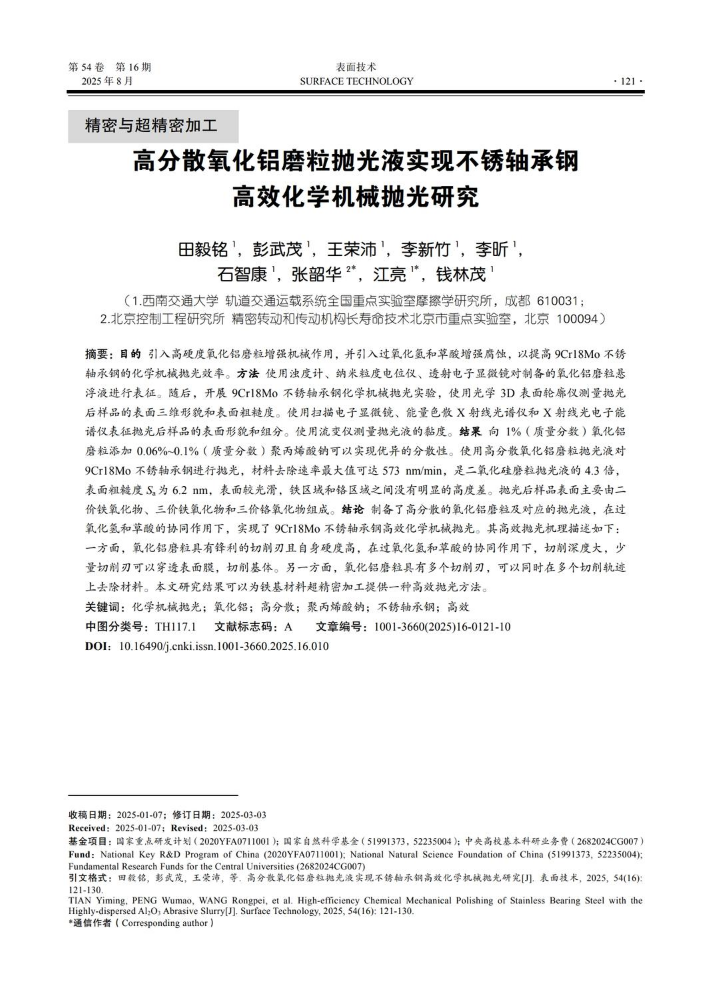 高分散氧化铝磨粒抛光液实现不锈轴承钢高效化学机械抛光研究