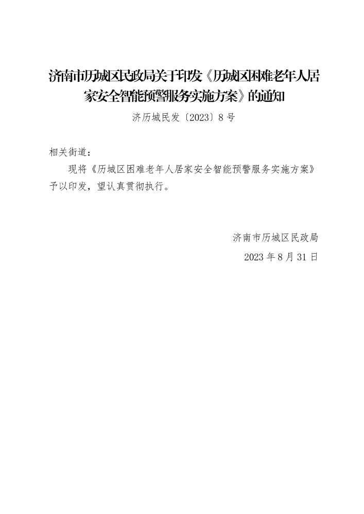 书刊名称:济南市历城区民政局关于印发《历城区困难老年人居家安全智能预警服务实施方案》的通知