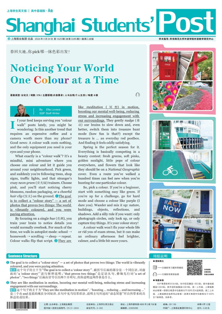 《上海学生英文报》高中基础版报纸,适合高一至高二学生。报刊内容与教材配套,辅助课堂教学和学校;目标量化,拓展学生阅读范围;根据高考题型配置习题,检测学生阅读能力;语篇标注,构建语篇关键要素标注体系。